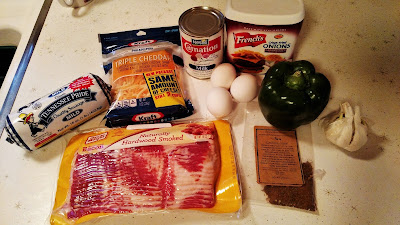 I started with a pound of mild breakfast sausage and some bacon. Then I decided some green pepper would be good. Then I noticed I had a can of the new caramelized French's fried onions, so I decided to use those instead of dicing some onion. Garlic, eggs, cheese, evaporated milk, and some seasoning (I used Caribbean blend from Spice Merchants), and I was onto something good.